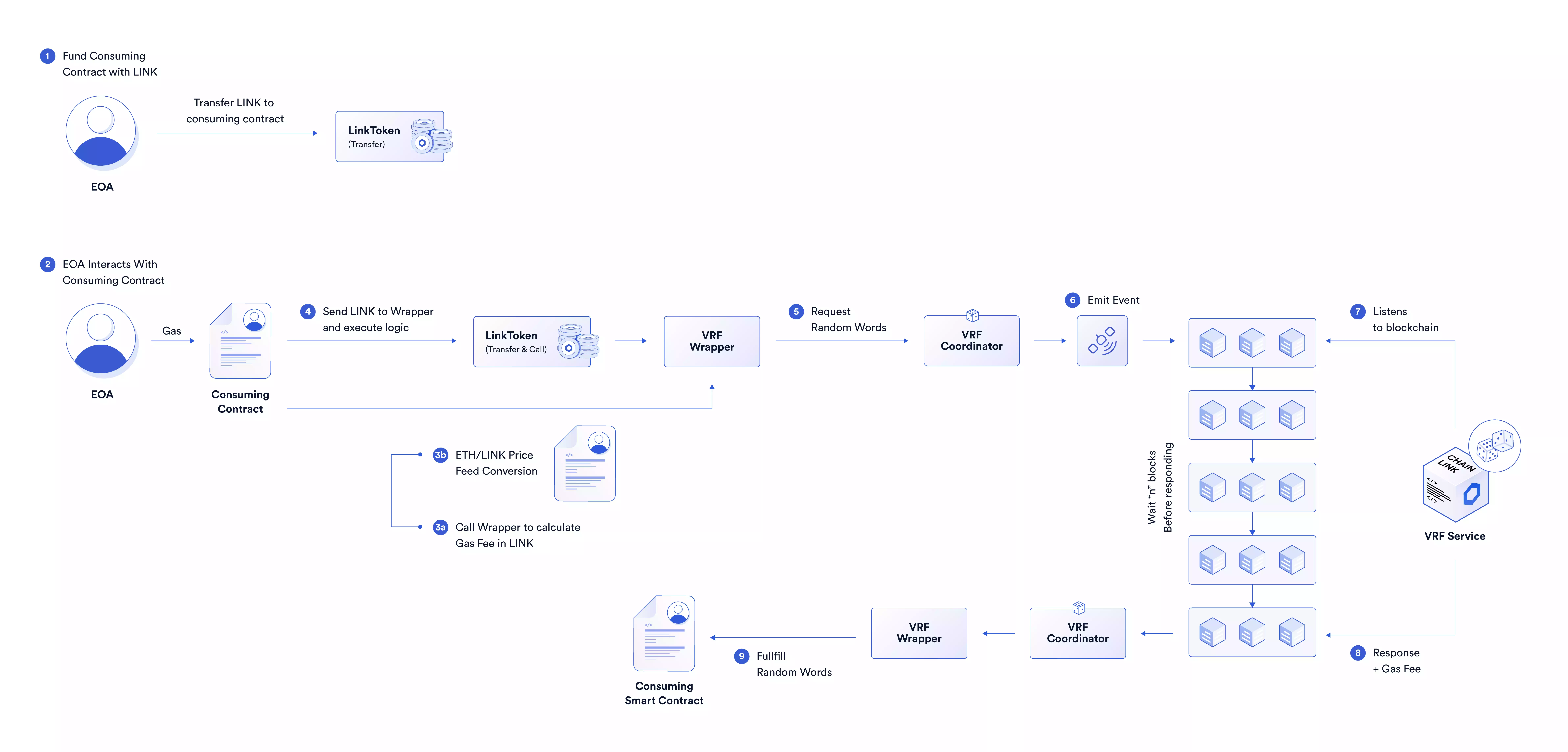• VRF v2 Wrapper (onchain component): A wrapper for the VRF Coordinator that provides an interface for consuming contracts.
